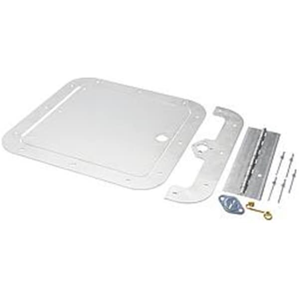 Aluminum panels can be mounted to provide easy access to dry sump pump tanks fuel cells or other under panel items. Kits include frame access door hinge quick turn fastener and quick turn fastener spring. Specifications - Finish: Black - Material: Aluminum - Size: 8in x 8in