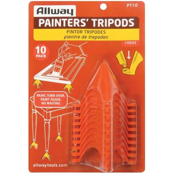 Use to support items like doors and dowels to keep them off the ground while you?re painting. Paint the top of your project turn over while still wet and paint other side. No waiting to dry and no more paint lines on your floor. Interlock to support unweidly items and they can be maneuvered into multiple positions depending on the shape of the item being painted. They can also be screwed down for additional security. Each pack includes 10 pieces. Features Tripod Painters Pack of 10 Specifications Weight: 0.1 lbs