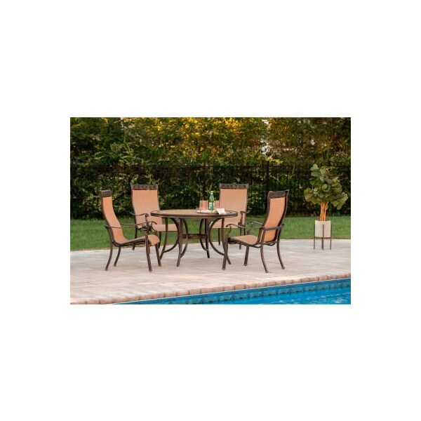 the classically designed monaco 5-piece dining set beautifully transforms any backyard into an elegant outdoor dining area with its superior quality and sleek comfort feel. Included in this set are four sling-back dining chairs and a 51" round dining table. Both chairs and table have alumnicast frames featuring heavy gauge aluminum-alloy extrusions and uniquely supported inner walls. The table-top is made of hand laid porcelain tiles onto natural, durable stone. Naturally porous, it has been specially sealed to resist moisture penetration. Built to last, this set will surely provide you with a natural alternative to entertaining indoors by accommodating your family and guests with the best outdoor dining under the sun. Minor assembly is required.