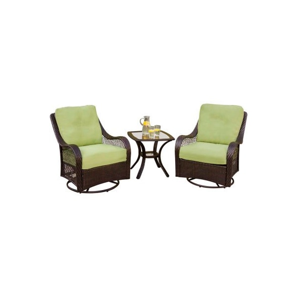 the vibrantly designed hanover orleans3pcsw 3-piece patio set transforms any backyard into an intimate relaxation area with its deep comfort feel and superior quality. This set is comprised of two deep-cushioned rocking chairs and an elegant glass end table, all featuring a rich chocolate-colored wicker frame composed out of hand woven straps, providing both crisp color pigments and ultimate uv protection. This sophisticated wicker is well coated to be all weather-resistant and rust free during the toughest weather conditions. Even the avocado-colored cushions are built to last with a high grade of 100% polyester wrapped around polyurethane foam, ensuring deep comfort while maintaining its original full shape. The fabric of the cushions are also specifically designed, woven, and treated for quick drying while resisting stains and uv harm. This 3-piece set will provide you with the most comfortable rocking relaxation under the sun. Minor assembly is required.
