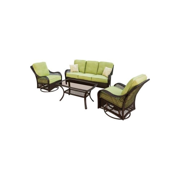 the vibrantly designed hanover orleans4pcsw 4-piece patio set transforms any backyard into a relaxation haven with its superior quality and deep comfort feel. This set is comprised of a coffee table, sofa, and two rocking chairs, all featuring a rich chocolate-colored wicker frame composed out of hand woven straps, providing both crisp color pigments and ultimate uv protection. This sophisticated wicker is well coated to be all weather-resistant and rust free during the toughest weather conditions. Even the cushions are built to last with a high grade of 100% polyester wrapped around polyurethane foam, ensuring deep comfort while maintaining its original full shape. The fabric of these pillows and cushions are also specifically designed, woven, and treated for quick drying while resisting stains and uv harm. Designed to last, this patio set will provide you and your guests with the ultimate relaxation area to complete your backyard oasis. Minor assembly is required.