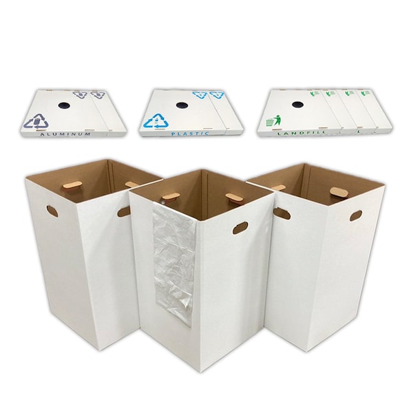 This special event bundle of 42-Gallon Corrugated Cardboard Waste and Recycling Containers 8-Pack, featuring a variety of lid styles, is designed for quick and convenient assembly, making them ideal for both indoor and outdoor events, gatherings, celebrations & more. Constructed from strong, durable corrugated cardboard, our boxes have self-locking folds on the bottom for simple setup/teardown. The holes on the sides allow for easy transportation and accommodate our liner bags for all of your disposal, recycle, and collection needs. Requires minimal assembly.
