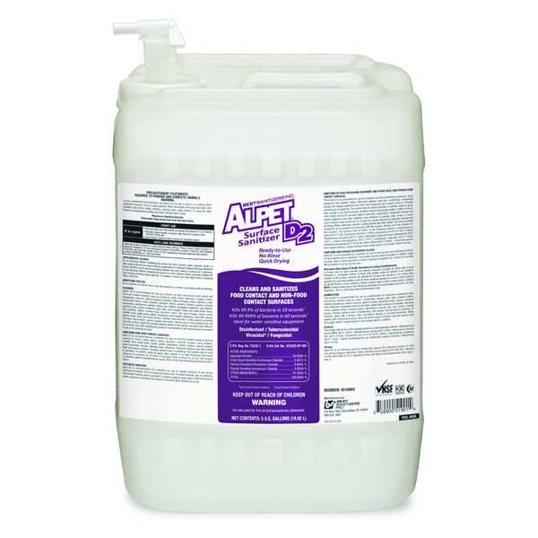 Disinfectant and Sanitizer, Primary Chemical Alcohol, Container Type Bucket with Spigot, Container Size 5 gal, Ready to Use/Concentrated Ready to Use, Recommended Dilution Ready to Use, Fragrance Alcohol, Cleaner Form Liquid, Surfaces for Use On Hard Nonporous Surfaces, Standards EPA Registered, Halal, Kosher, Letter of Guarantee, NSF Rated, Pareve, Wet Contact Time 10 sec to 1 min, Targeted Pathogens E-coli; H1N1; HIV; Listeria; MRSA; Norovirus; Salmonella, Product Series Alpet D2