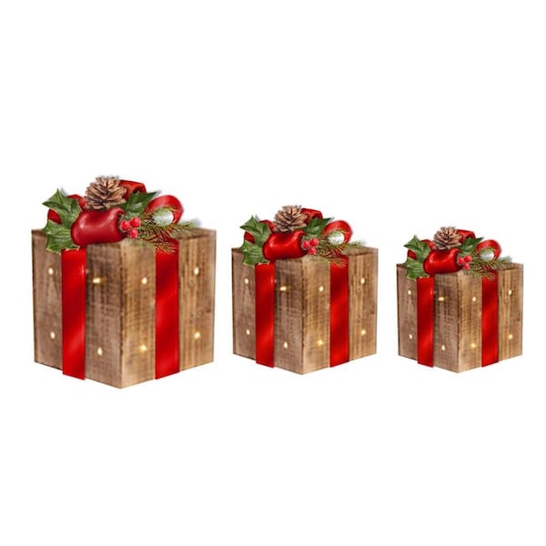 Brighten your holiday decor with our charming Red Bow Wood Gift Decor set! This delightful trio features a large medium and small gift design each adorned with a vibrant red bow and illuminated by 42 warm white LEDs. Perfect for adding a festive touch to your home these decorative gifts look stunning grouped together or displayed individually throughout your space. Made from high-quality wood they bring a cozy rustic feel to your holiday celebrations.