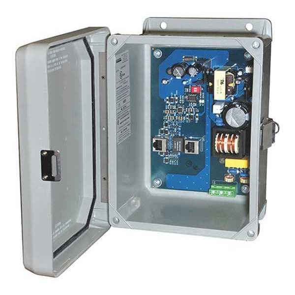 PoE Injector, Product Type PoE Injector, Maximum Input Voltage 115/230V AC, Maximum Output Voltage 56V DC, Mounting Location Wall, Color Gray, Features (3) Wire Glands, Hi-PoE/PoE+/PoE Connectivity, Integral Flanges and Surge Protection, Midspan Port, Outdoor, Port Status LED Indicator, Provides Power and Data Up to 100m Away, Includes Lockable Stainless Steel Latch, Material Fiberglass, Polyester, Overall Depth 4 7/8 in, Overall Height 9 1/4 in, Overall Width 7 1/4 in