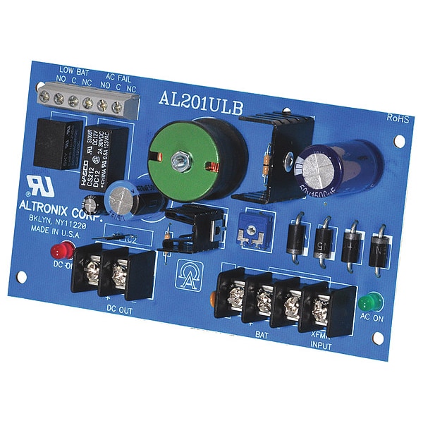 Power Supply 12/24Vdc 1.75A, Type Power Supply/Charger Board, Material Phenolic or Fiberglass, Length 4.60 In, Width 7.50 In, Height 2.70 In, Input Voltage 24VAC, Voltage OUTPut 12VDC or 24VDC, OUTPut Current 1.75A Amps, Input Frequency 60 Hz, Standards UL RECOGNIZED UL294, Includes Battery Leads, Tape