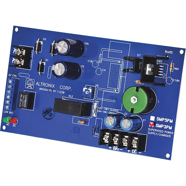 Power Supply 12/24Vdc @ 2.5A Supervised, Type Power Supply/Charger Board, Material Phenolic or Fiberglass, Length 7.00 In, Width 4.00 In, Height 1.50 In, Input Voltage 12VAC to 28VAC, Voltage OUTPut 12VDC or 24VDC, OUTPut Current 2.5A Amps, Input Frequency 60 Hz, Includes Battery Leads, Tape