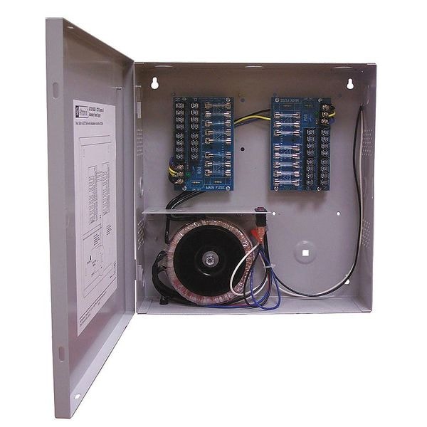 Power Supply 16Fuse 24Vac @ 14A, Type CCTV AC, Wall Mount, Material Steel, Finish Gray, Enclosure Depth 3.25 In, Enclosure Width 13.00 In, Enclosure Height 13.50 In, Input Voltage 115VAC, Voltage OUTPut 24VAC or 28VAC, OUTPut Current 24VAC @ 14A or 28VAC @ 12.5A Amps, Input Frequency 60 Hz, Standards CE, Includes Cam Lock, Line Cord, Spare Fuse