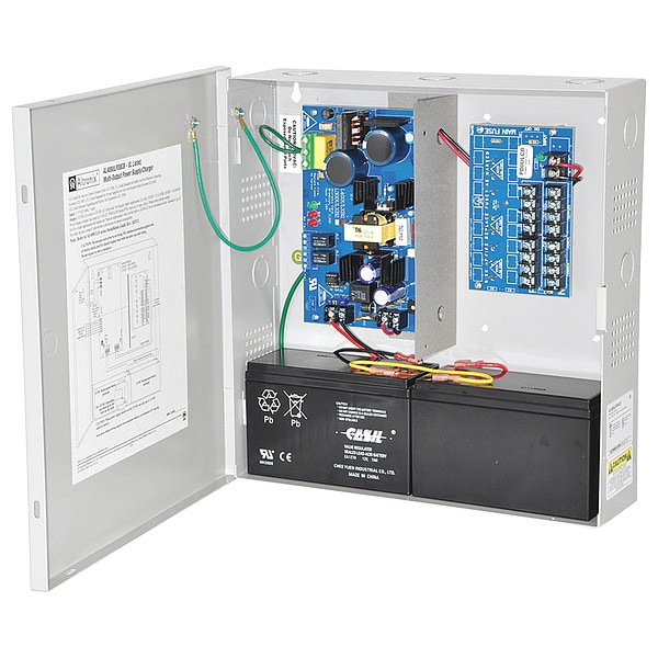 Power Supply 8Ptc 12Dc/3.5A Or 24Dc/3A, Type Multi-OUTPut Power Supply/Charger, Material Steel, Finish Gray, Enclosure Depth 3.25 In, Enclosure Width 13.00 In, Enclosure Height 13.50 In, Input Voltage 115VAC, Voltage OUTPut 12VDC or 24VDC, OUTPut Current 12VDC @ 4A or 24VDC @ 3A Amps, Input Frequency 60 Hz, Standards UL294, UL603, UL1069, UL1481, CUL, Includes Battery leads, Cam Lock