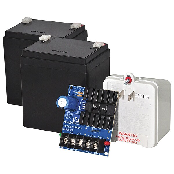 Power Supply 24Vdc @ 1.2A Kit W/4A Battery, Type Power Supply/Charger Kit, Material Phenolic or Fiberglass, Length 3.00 In, Width 2.50 In, Height 1.50 In, Input Voltage 115VAC, Voltage OUTPut 24VDC, OUTPut Current 750mA Amps, Input Frequency 60 Hz, Includes AL624, 4AH Battery, 24VAC/40VA Transformer