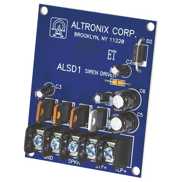 Siren Driver 6-12Vdc 2 Ch Hi Current, Type Siren Driver, Material Phenolic or Fiberglass, Length 2.75 In, Width 1.75 In, Height 1.10 In, Input Voltage 6/12VDC, Includes Tape