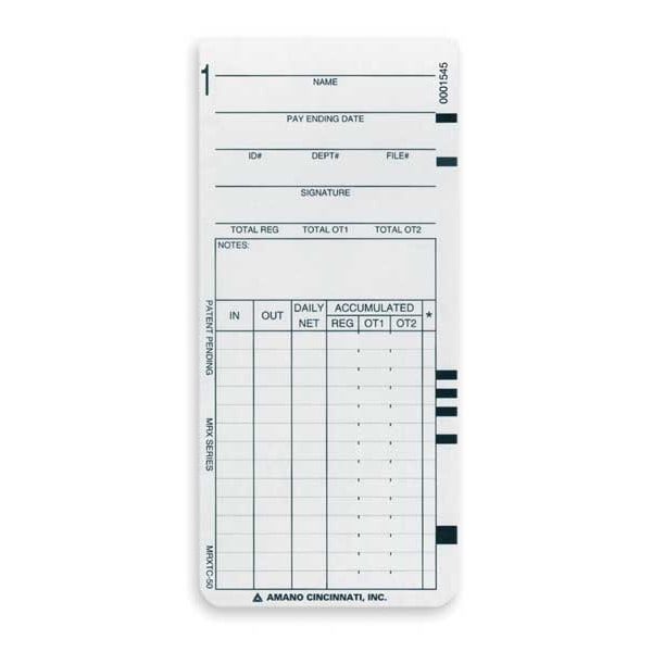 Time Card, Payroll, Records Bi-Weekly, Weekly, Number of Sides 1, Height 7 1/4 in, Width 3 1/2 in, For Use With Amano MRX-35, Package Quantity 1000