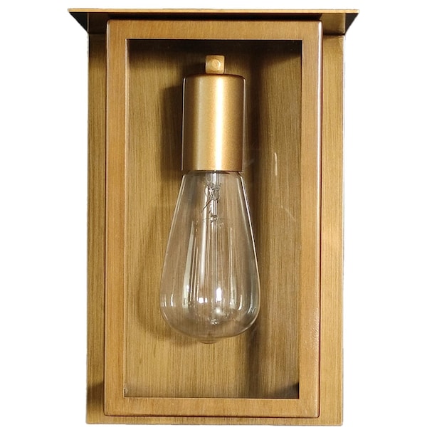 The Alicia outdoor wall sconce will bring a modern touch to your home or business. It features an open painted gold metal cage with clear glass panels. The single medium based E26 socket is perfect for use with and Edison T10 filament bulb or LED Edison Bulb 60 Watts Max, Bulb Not Included. Suitable for commercial and residential installations. Dimmable when used with dimmable bulbs and compatible dimmer. ETL Listed for safety and quality.