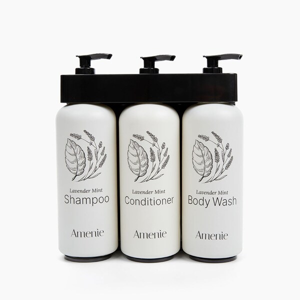 Amenie Lavender Mint Triple Dispenser, Eco-Friendly, Efficient Shower Storage With the Amenie Lavender Mint Triple Acquavera Dispenser, keeping your guest bathrooms organized has never been easier. Designed for high-traffic areas, this dispenser neatly stores your shampoo, conditioner, and body wash, offering a clutter-free and efficient solution for hotels, B&Bs, and vacation rentals. Infused with nourishing botanical extracts and calming lavender oils, it delivers a spa-like shower experience that leaves your guests refreshed and rejuvenated.