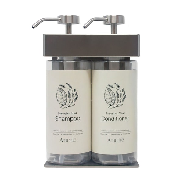 Amenie Lavender SOLera Pump, Refillable Shampoo & Conditioner Dispenser The Amenie Lavender Mint SOLera Oval 2 Chamber Dispenser brings both functionality and style to any high-traffic environment, offering a sleek solution for keeping shower essentials organized. Designed with eco-conscious businesses in mind, this wall-mounted dispenser features dual, refillable chambers that reduce single-use plastic waste while delivering quality amenities to guests. Made from durable food-grade PET, it stands up to frequent use, making it the ideal addition to hotels, spas, or wellness facilities. Its compact design ensures it blends effortlessly into any modern restroom, while the easy-refill system keeps things running smoothly with minimal downtime. Available in Satin Finish and Black, it complements a variety of bathroom decors while holding a generous 24 oz 720 mL of Amenie Lavender Mint Shampoo and Conditioner, ensuring your guests always have access to fresh, soothing products.