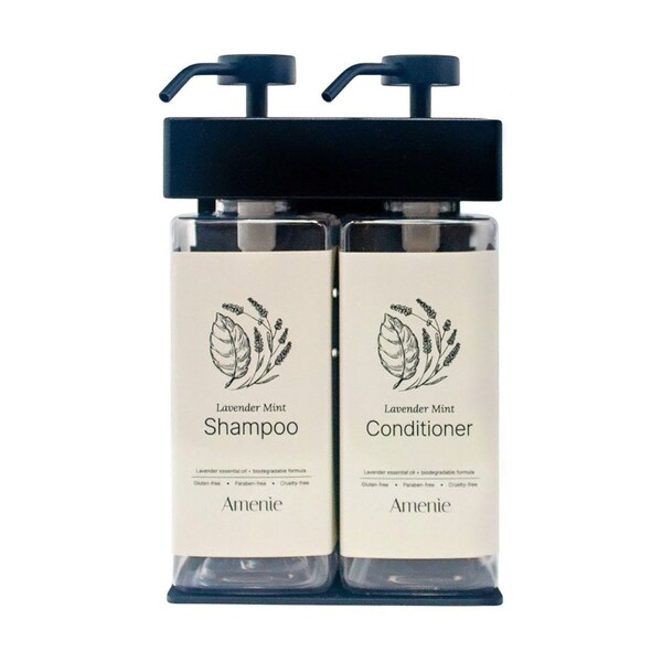 Amenie Lavender Mint SOLera Dispenser, 2-Chamber Dispenser for Hotel Bathrooms Keep your guest bathrooms tidy and eco-friendly with the Amenie Lavender Mint SOLera 2-Chamber Dispenser. Perfectly suited for high-traffic areas like hotels and spas, this sleek, rectangular dispenser complements modern bathroom decor while offering easy access to both shampoo and conditioner. With its refillable chambers, it helps reduce plastic waste, providing an environmentally responsible option for your business. Made from durable, food-grade PET plastic, this dispenser is designed to handle frequent use, ensuring long-lasting reliability. Choose between the Satin Finish or Black, and enjoy a seamless fit in any setting. The user-friendly refill system ensures your shower essentials are always stocked, making it a perfect choice for eco-conscious businesses seeking sustainability and convenience.