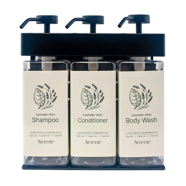 SOLera 3-Chamber Rectangle Pump, Wall-Mounted Shower Liquid Dispenser Organize your guest bathrooms with the Amenie Lavender Mint SOLera 3-Chamber Dispenser, designed to offer a practical and stylish solution for high-traffic spaces like hotels, B&Bs, and vacation rentals. This sleek dispenser allows for easy access to shampoo, conditioner, and body wash, helping reduce clutter while providing an efficient storage option for your shower essentials.