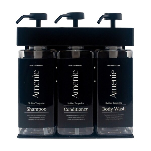 - Two refillable chambers featuring elegantly labeled Amenie Sicilian Tangerine pump bottles