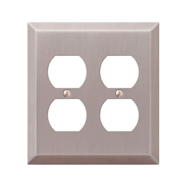 Features Number of Gangs: 2 gang Color: Brushed Nickel Material: Stamped Steel Switch Style: Duplex Outlet Product Type: Wall Plate Number in Package: 1 pk Number of Outlet Openings: 4