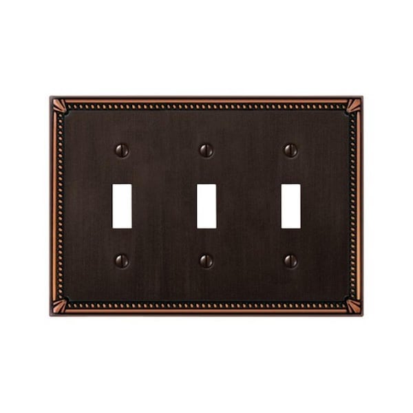 Features Imperial Bead 3 Toggle Wall Plate 3 toggle Finish: Aged bronze Cast metal Matching screws Imperial bead Complements bath and lighting fixtures Elegant beaded design with a lacquer finish Specifications Dimension: 7.5in H x 7.9in W x 0.3in L Weight: 0.7 lbs