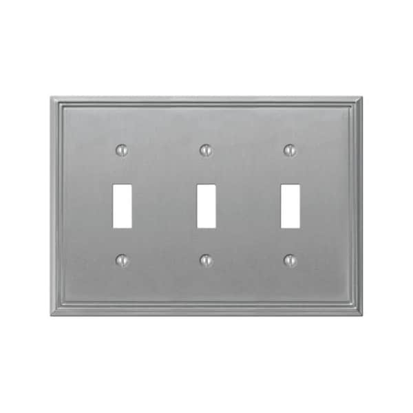 Features Metro Line 3 Gang Toggle Wall Plate 3 toggle Finish: Brushed Nickel Made of cast metal style and durability The perfect finish for any room, simple elegant design Includes matching screws for an easy installation Specifications Dimension: 7.5in H x 7.9in W x 0.4in L Weight: 0.6 lbs