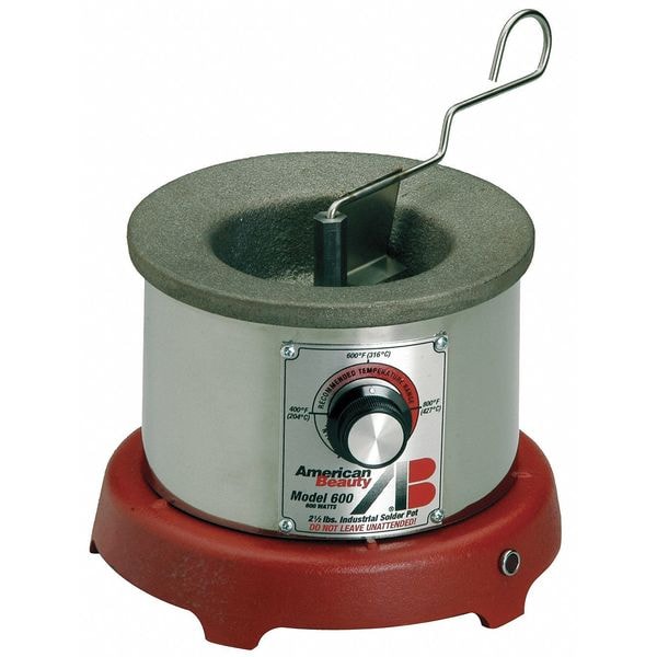 Solder Pot, Power Consumption 600 W, Pot Capacity 3.5 lb, Pot Interior Dimensions 1 1/2 in D x 3 1/2 in Dia, Crucible Shape Round, Display Type Analog, Operating Voltage 120 V, Operating Temperature (Minimum) 350 Degrees F, Operating Temperature (Maximum) 850 Degrees F, Application Dip Soldering, Tinning, Bar Capacity 3 Bars CS-PBF4 or 8 Bars CS-PB50-3, Crucible Material Gray Cast Iron, Display Units of Measure Celsius; Fahrenheit
