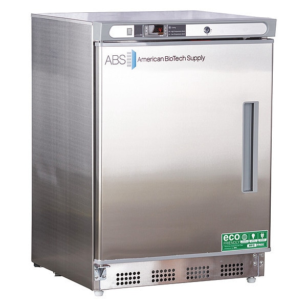 Refrigerator, Application - Laboratory Refrigerator/Freezer High Performance, Laboratory Refrigerator/Freezer Style Undercounter, Refrigerator Capacity (Cu.-Ft.) 4.5 cu ft, Refrigerator Temperature Range (C) 34 Degrees to 50 Degrees , Overall Depth 24 1/2 in, Overall Height 33 3/8 in, Overall Width 23 3/4 in, Defrost Cycle, Refrigerator Temperature Range (F) 34 Degrees to 50 Degrees , Amps 1.74, Hz 60, Voltage 115V, Color Silver, Door Hinge Left, Door Type Swing Solid