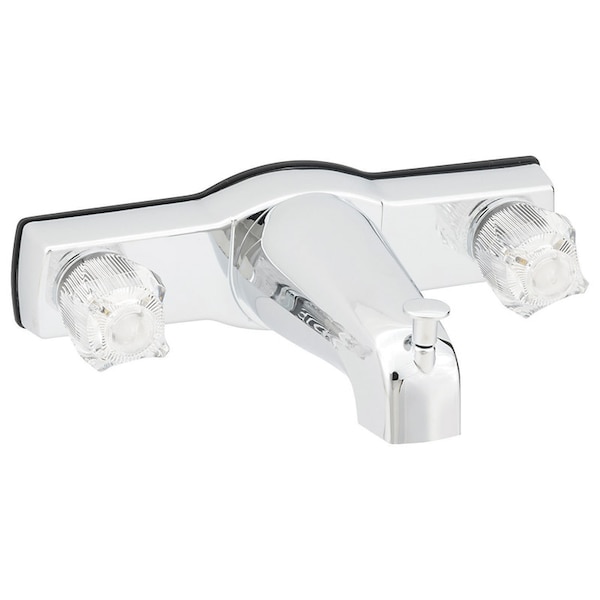 Popular Mobile Home shower diverter faucet upgrade. Faucet is made with durable one-piece metal brass valve to last a lifetime. Fits standard 2-hole shower 8-inch on center. Tub & shower diverter feature on spout diverter. Finished in classic clean chrome with jewlite crystal handles. Includes shower kit (head, arm, and flange). Upgrade today! Pairs with CRD-HAF