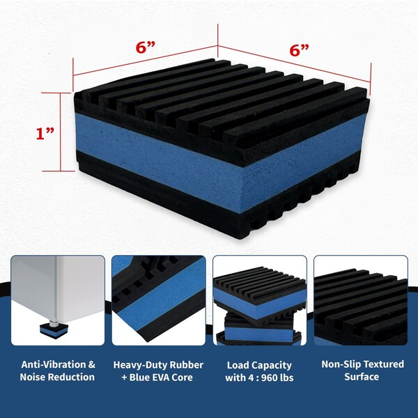 2 inch square heavy duty, durable, non-slip, high-strength black rubber anti-vibration pad with blue EVA shock absorption core (16-pack).