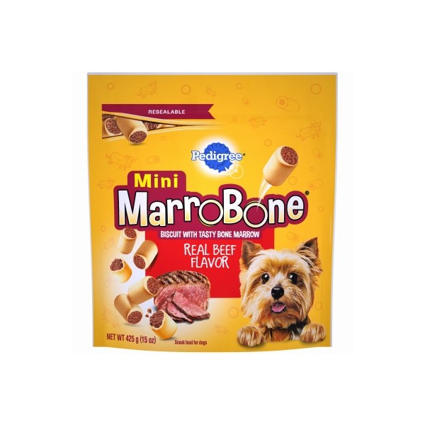 Pedigree 15 OZ Mini Marrowbone Dog Treat Flavor Snacks For Small Dogs Made With Real Bone Marrow Crunchy Bone Like Outside Surrounding A Meaty Interior For Teeth & Gum Health Vitamin A D & E Enriched Which Helps Promote A Shiny Coat Strong Teeth & Healthy Bones.