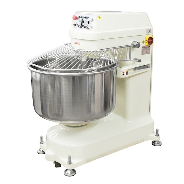 Heavy-duty agitator is 25% thicker than industry leader Handles heavier pizza & bagel dough with ease Reversible mixing action makes better dough, and in less time Heavy-duty construction and powerful two-motor system Easy maintenance and time-saving versatility Heat treated enamel coating resists scratches, rust, and dents Overload relay protects motor and transmission Premium electronic components for reliable operation Multiple-V-belt drive design with embedded ï¬bers for extra strength ETL-certified to conform to NSF No. 8, CSA, CE standards Dual 30 minute timers with automatic switching between low and high speed Heavy-duty, 7 foot, four wire power cable Details AE-4065 100QT spiral mixers meet every bakers challenge: high-capacity, high-efficiency machines at an affordable price. Their exceptional reliability make it ideal for busy cooks by decreasing mixing times and maintenance. This versatile mixer makes a variety of dough from bagels to pizza. American Eagle® spiral mixers imitate hand kneading and rolling motions. The gentle coordinated movement of bowl and agitator controls blending while preventing overdeveloped dough. The dough stays cooler, mixes in less time, and has better consistency. Enjoy the best productivity with higher bowl capacity and significantly reduced blending times compared to a planetary mixer! With dual 30 minute timers and a 3-mode reversible mixing bowl (clockwise, stop, counter-clockwise), your dough can be mixed to your perfection! Safety guard has to be down completely in order for machine to turn on. Front guard has an opening for adding ingredients while mixing. Covered by a 1 Year limited warranty.