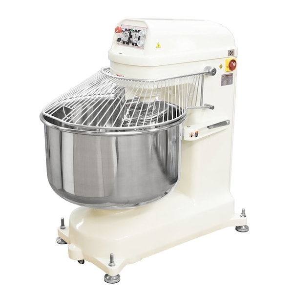 Heavy-duty agitator is 25% thicker than industry leader Handles heavier pizza & bagel dough with ease Reversible mixing action makes better dough, and in less time Heavy-duty construction and powerful two-motor system Easy maintenance and time-saving versatility Heat treated enamel coating resists scratches, rust, and dents Mounted on castors for extra mobility and easy maintenance Overload relay protects motor and transmission ETL certified to conform to NSF No. 8, CSA, CE standards Dual 30 minute timers with automatic switching between low and high speed Heavy-duty, 7 foot, four wire power cable Details AE-75K 190QT spiral mixers meet every baker's challenge: high-capacity, high-efficiency machines at an affordable price. American EagleĀ® spiral mixers imitate hand kneading and rolling motions. The gentle coordinated movement of bowl and agitator keeps dough cool while mixing for consistent texture. Dough does not over-develop and blends in half the time as a comparable planetary mixer! With dual 30 minute timers and a 3-mode reversible mixing bowl (clockwise, stop, counter-clockwise), your dough can be mixed to your perfection! Safety guard has to be down completely in order for machine to turn on. Front guard has an opening for adding ingredients while mixing. Covered by a 1 Year limited warranty.