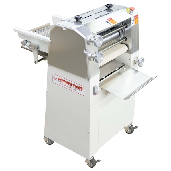 1/2 HP motor Moulds 600-800 pieces of dough per hour Enamel White Paint Finish Resists Rust and Corrosion 115V/60Hz/1Ph With NEMA 5-15P Plug Standard 220V/60Hz/1Ph Available As Special Order Heavy Duty Cast Iron Frame And Steel Panels Thermal Overload Protection Helps Protects Motor Stainless Steel Curling Chains, Sanitary Polyurethane Conveyor Belts Heavy Duty Stainless Steel Rollers Durable Gear and Chain Driven Transmission Ergonomically Friendly Front Facing Controls and Input/Output Independent On/off , Emergency Stop Button Overall Measurements: 40"L x 24"W x 42.5"H Overall Measurements: 102cm x 61cm x 108cm Net Weight: 310 lbs (141kg) Gross Weight: 389lbs (176kg) Details The AE-DM31 is perfect for moulding dough for bread (such as French Bread, hot dog bread, dinner roll and etc.), pizza, toast, Chinese bun (including spring onion cake, red turtle, Chinese burger bread and etc.), pretzels, and doughnuts. The clearance of the upper and bottom rollers are adjusted accordingly to the volume and hardness of the dough, with air bubbles being completely rolled and dispersed as the dough passes through. Dough is pulled through an initial set of upper and bottom rollers, then passed through a flexible stainless steel curling wire mesh net, and lastly pressed by a bottom mounted pressure board which consistently curls and molds the dough to meet the final desired outcome. With a dual level design, the moulder features extra compact design, and with an adjustable pressure board with front mounted controls, easily adjust the board to a precise height that will assure a desired curling finish. This Dough Moulder requires very little labor to install, with an easy to connect 115V electrical plug standard (220V available as special order), castors with built in locks for extra mobility, and overall compact size that saves space.