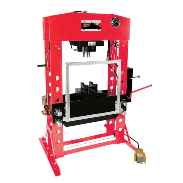 The AFF Super Duty 150 Ton Shop Press features welded construction for exceptional strength and durability, and includes 2 piece press plate set and a double pump air motor for faster speeds. Mobility of this super duty 150 Ton Shop Press is enabled by lateral head adjuster and provides smooth side-to-side movement for a greater working range. Its 7 position bed height configuration allows for ultimate operator flexibility, along with a heavy duty cable winch for effortless bed adjustment. Its Glycerin filled gauge accurately shows pressing force. Established in 1963, American Forge & Foundry (AFF) has provided value through our selection of highest-quality, "forge tough" heavy-duty and automotive service equipment. From our extensive inventory of parts to the hundreds of service depots available nationwide our experienced team is committed to ensuring that the AFF brand stands for durability, safety, and customer care. Established in 1963, American Forge & Foundry (AFF) has provided value through our selection of highest-quality, "forge tough" heavy-duty and automotive service equipment. From our extensive inventory of parts to the hundreds of service depots available nationwide our experienced team is committed to ensuring that the AFF brand stands for durability, safety, and customer care.