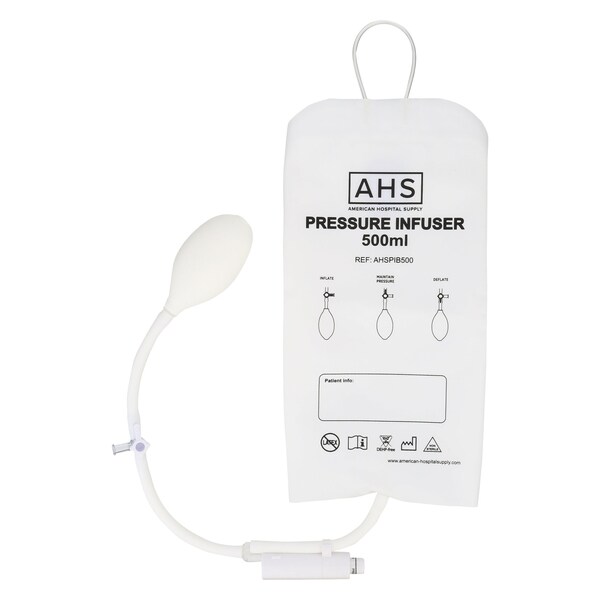 This latex-free pressure infusion bag from American Hospital Supply is designed for premium quality, reliability, and safety during clinical administration patient pressure measurement and fluid management. The IV bag comes in three sizes: 500 ml, 1000 ml, or 3000 ml to be compatible with most standard IV solution bags. Our pressure infusion bags are designed for single patient use and include a patient identification section.