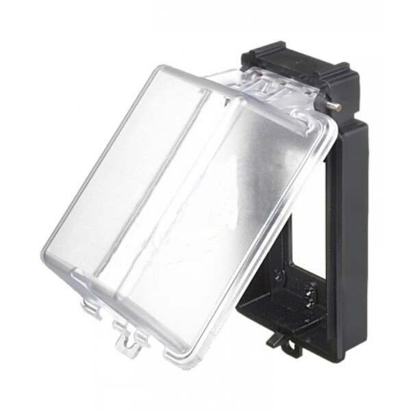 THIS PRODUCT INCLUDE(S): 1x outdoor electrical cover in black color (35049). LOCKING OUTDOOR IN-USE COVER. BLACK POLYCARBONATE WITH CLEAR COVER. INCLUDES GASKET. RATED EXTRA HEAVY. NON-CORROSIVE. 2.75 DEPTH. WORKS WITH STANDARD, DECORATOR, AND GFCI OUTLETS AS WELL AS STANDARD AND DECORATOR SWITCHES. This outdoor electrical cover features a rectangle shape with a modern style. This product is made for wall mount installation. DIY installation instructions are included in the box. This outdoor electrical cover is made with plastic. The primary color of this product is black and it comes with clear hardware. 3.81-in. Width (left to right). 4.85-in. Depth (back to front). All dimensions are nominal.