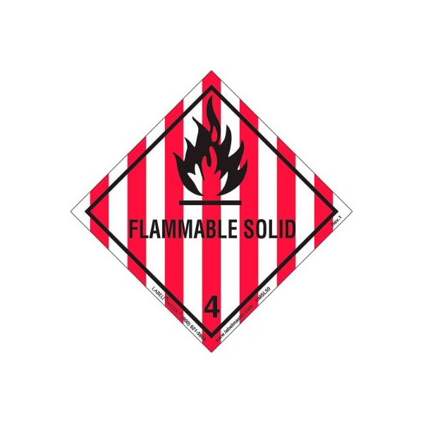 Labelmaster hmsl50 flammable solid label, worded, pvc-free film, 500/roll ship with confidence when you use labelmaster's worded flammable solid labels, revised to meet the design requirements of 49 cfr 172.407. In addition to complying with directives set by the dot, these also meet the design and durability standards of 49 cfr, icao and other international air regulations. You'll be worry-free as these hazard class 4 labels are printed with light-fast inks for fade resistance, and adhesives are formulated for use in various climates and environments as well as strong holds on corrugated boxes. Once affixed, they won't fade or fall off. They also feature outstanding chemical and abrasion resistance. Striped red and white, these pvc-free vinyl labels are sized at 100 x 100mm (4 x 4 in.) and sold in rolls of 500.