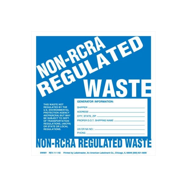 play it safe when shipping non-rcra regulated waste with labelmaster's non-rcra regulated waste labels. Using your pc and printer, their ruled lines allow you to fill in the information necessary for marking a container for transport in compliance with the dot and epa regulations. Constructed of rugged, weather-resistant pvc-free vinyl, these flexible labels feature automotive-grade ink pigments and specially formulated adhesives. They also pass the 90-day imo seawater immersion test. They measure 6 x 6 in. And are sold in packs of 100.
