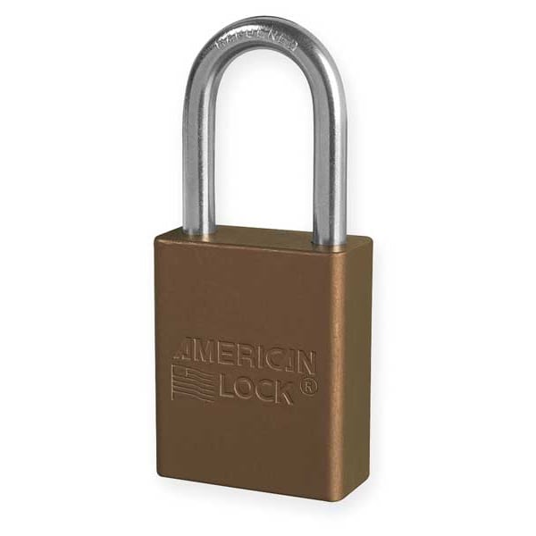 Lockout Padlock, Body Color Brown, Body Height 1 7/8 in, Body Material Aluminum, Body Thickness 3/4 in, Body Width 1 1/2 in, Header Not Applicable, Horizontal Shackle Clearance 13/16 in, Key Style Standard, Key Type Keyed Different, Non-Removable Key No, Resistance Properties Corrosion Resistant, Shackle Diameter 1/4 in, Shackle Height 1 1/2 in, Shackle Material Boron Alloy, Shackle Type Open, Vertical Shackle Clearance 1 1/2 in, Width Across Shackle 13/16 in, Body Material Coating Anodized