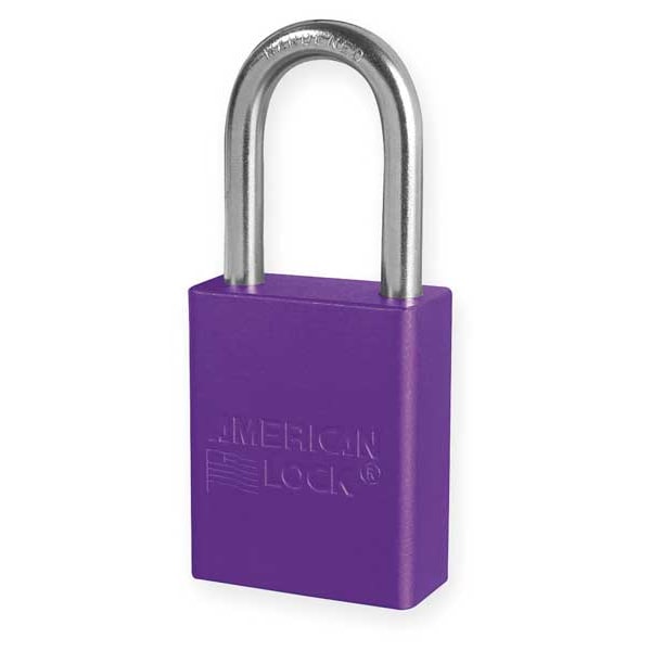 Lockout Padlock, Body Color Purple, Body Height 1 7/8 in, Body Material Aluminum, Body Thickness 3/4 in, Body Width 1 1/2 in, Header Not Applicable, Horizontal Shackle Clearance 13/16 in, Key Style Standard, Key Type Keyed Different, Non-Removable Key No, Resistance Properties Corrosion Resistant, Shackle Diameter 1/4 in, Shackle Height 1 1/2 in, Shackle Material Boron Alloy, Shackle Type Open, Vertical Shackle Clearance 1 1/2 in, Width Across Shackle 13/16 in, Body Material Coating Anodized