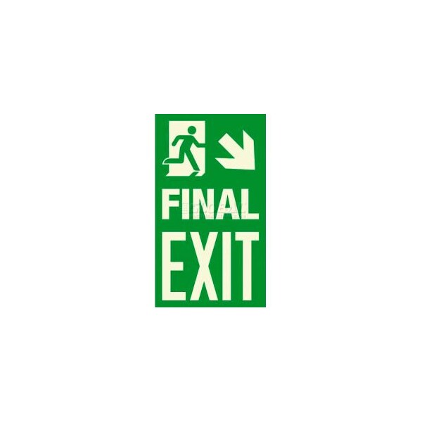 Photoluminescent sign - final exit, man right/arrow down right - green - with adhesive this 8"w x 14"h yellowish/green photoluminescent sign is made of sturdy aluminum for long lasting durability and dependability. Photoluminescent coating absorbs and stores energy from ambient lighting, making sign immediately visible in case of black-out or underneath smoke. Ideal for all surfaces, including rough surfaces and brick walls. Easy to install. Simply remove blue adhesive protector and firmly press-apply sign to clean, dust-free, dry wall surface. Nyc mea listed by new york city department of buildings. Uv-resistance rated.