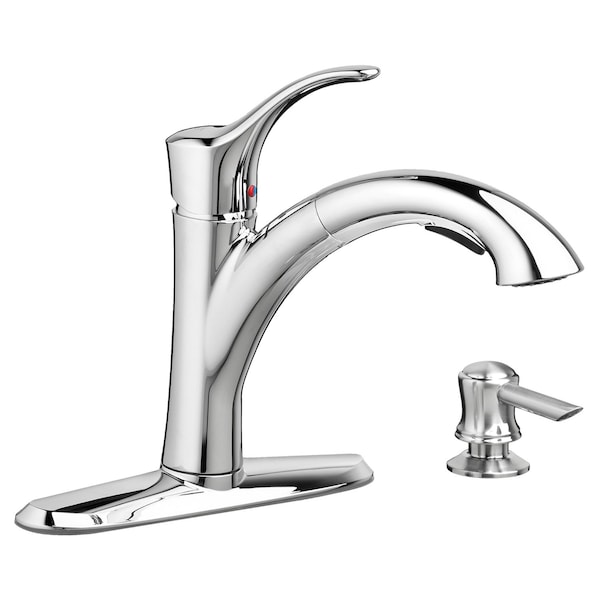 Handsome in appearance, hardworking in attitude. The Mesa one-handle, pull-out faucet goes well with casual kitchens. Features include a swivel spout, pull-out spray with push-button switch, memory position valving that provides water at your preferred temperature, separate deck-mount soap dispenser and ADA-approved lever handle.Style and substance strike a perfect balance in the kitchen faucet collections from American Standard. Our kitchen faucets are engineered to look beautiful and function flawlessly. Worry-free, drip-free and built to last, all of our kitchen faucets are covered by our Limited Lifetime Warranty on function and finish. Won't wear out Silky smooth operation, scratch and corrosion resistant Convenient, flexible pull-out spray head makes clean-up easy 20 inch Factory Installed Flexible Supply Lines with 3/8 inch Compression Connections Extra-Long Mounting Post fits the thinnest .