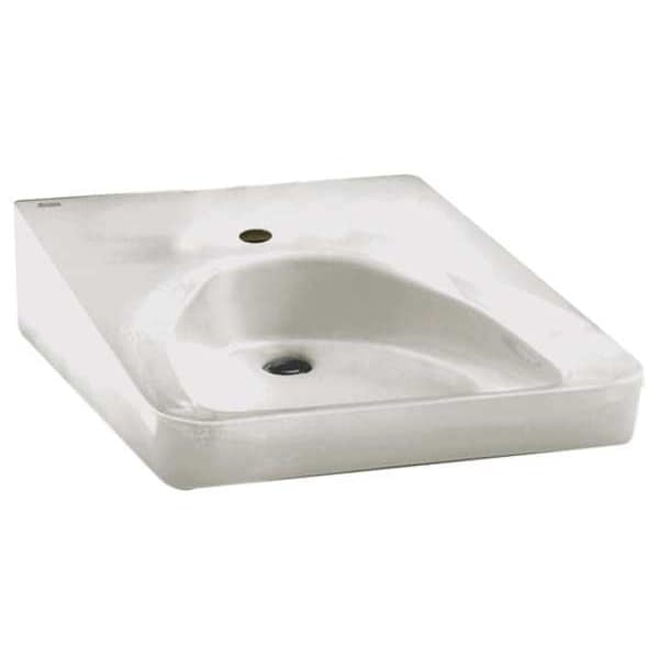 Bathroom Wheelchair Sink, Without Faucet, Body Material Vitreous China, Mounting Type Wall, Color White, Overall Length 27 In., Overall Width 20 In., Overall Height 6-5/8 In., Bowl Size 14 In. x 14-3/4 In., Bowl Depth 4-3/4 In., ADA Compliant Yes, Back Splash No, Bowl Shape D-Shaped, Side Splash No, Number of Stations 1, Drain Opening 1-1/4 In., Number of Holes 1, Includes Front Overflow, Faucet Ledge, Manufacturers Warranty Length 1 yr. Commercial