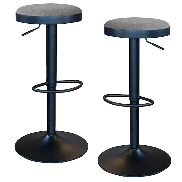 Set includes 2 charcoal grey fabric bar stools, with matte black pedestal base.