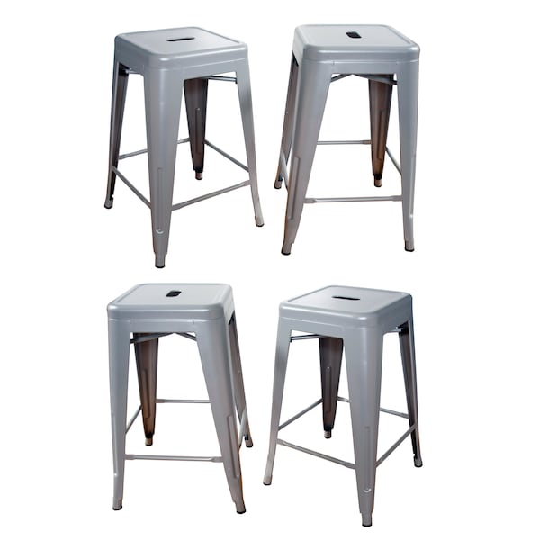 These 24" AmeriHome Metal Bar Stools are great for man caves, dorm rooms, and basement bars. Ideal for small spaces, the bar stools easily and neatly stack together, making them easy to stash out of the way for storage. Each stool weighs only 11 lbs., but is strong enough to hold up to 330 lbs. No-mar rubber feet keep them from sliding and scratching hardwood floors. Each Bar Stool stands 24" tall with a seat measuring 12" L x 12" W. Sold in a set of 4.