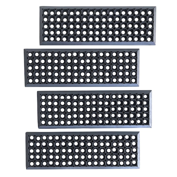 Use the AmeriHome 4 Rubber Stair Tread with Drainage Holes to to help prevent slippery steps, near misses or wipeouts. Sold in a 4 pack, the heavy duty rubber Stair Treads ate great for the front steps, or anywhere that gets lots of foot traffic. The non-slip surface gives you more traction when the surface gets slippery with rain and snow. Ideal for both industrial applications like warehouses and office buildings, and for use at home on slippery deck stairs and porch steps.
