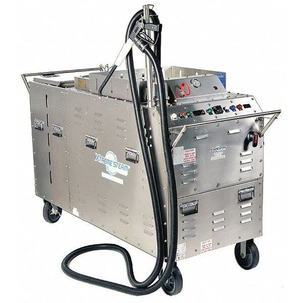 Steam Generator, Steam Production 88 lb/hr, Water Tank Capacity 25 gal., Working Pressure 0-180 psi, Voltage 360 to 600, Wattage 50000, Phase Three, Max. Temp. 380 Degrees F, Temperature at Tip 220 Degrees F, Height 54 In., Depth 84 In., Width 32 In., Speed Variable, Operating Time 24/7, Amps 44 to 75, Hz 60, Cap Non-Pressurized, Includes Basic Tools, 10 ft. Hose