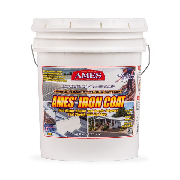 Ames' Iron Coat is a special blend of acrylic and rubber to form an up to 500% elastomeric coating specifically designed for metal with built-in metal bonders and primers. Waterproofing and maintaining residential and commercial metal roofing has never been easier. No mixing required, easy to apply, and easy to clean up. Ames® Iron Coat® also reflects up to 98% of UV rays to reduce the temperature of your roof and home to save you energy and money on cooling costs. • Built-in Metal Bonders & Primers