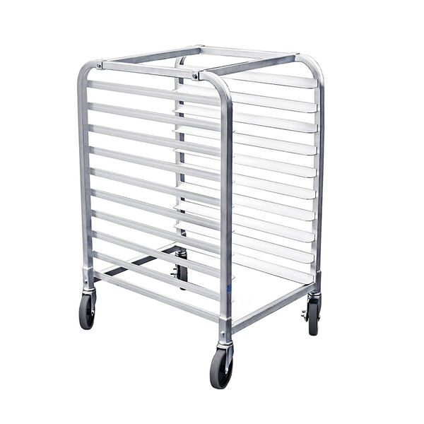 The 10 pan end load half height bun pan rack is perfect for your low- to medium-volume kitchen. Use this product to hold and transport pans full of doughnuts, cookies, baked chicken, or other foods around your back- and front-of-house area. Thanks to its sturdy metal construction, this rack is extremely durable to withstand use in your commercial restaurant, bakery, or cafeteria.