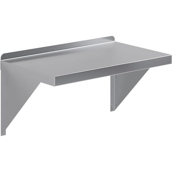 - • 14 in. x 24 in. Stainless Steel Wall Shelf with squared edge and 12 in. High Mounting Brackets. This heavy-duty multifunctional stainless wall shelf is made with 18 gauge stainless steel and can hold up to 240 Lbs of weight. The design features a 1 in. backsplash. It's made with durable welded corners and support brackets.